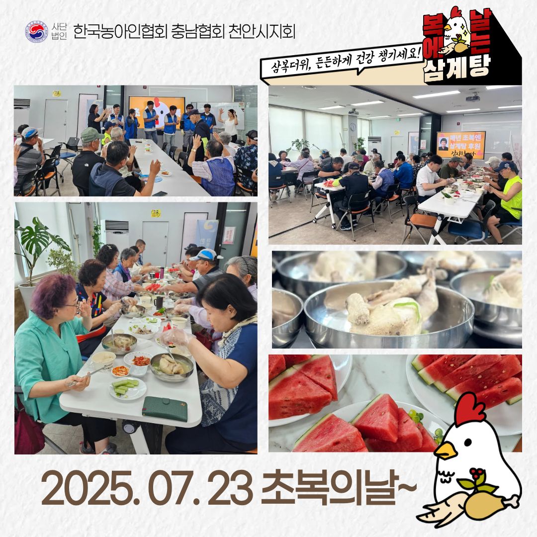 회원들이 함께 봉사하여 맛있는 삼계탕과 🍉 수박, 🍡 떡을 준비해 주셨습니다.