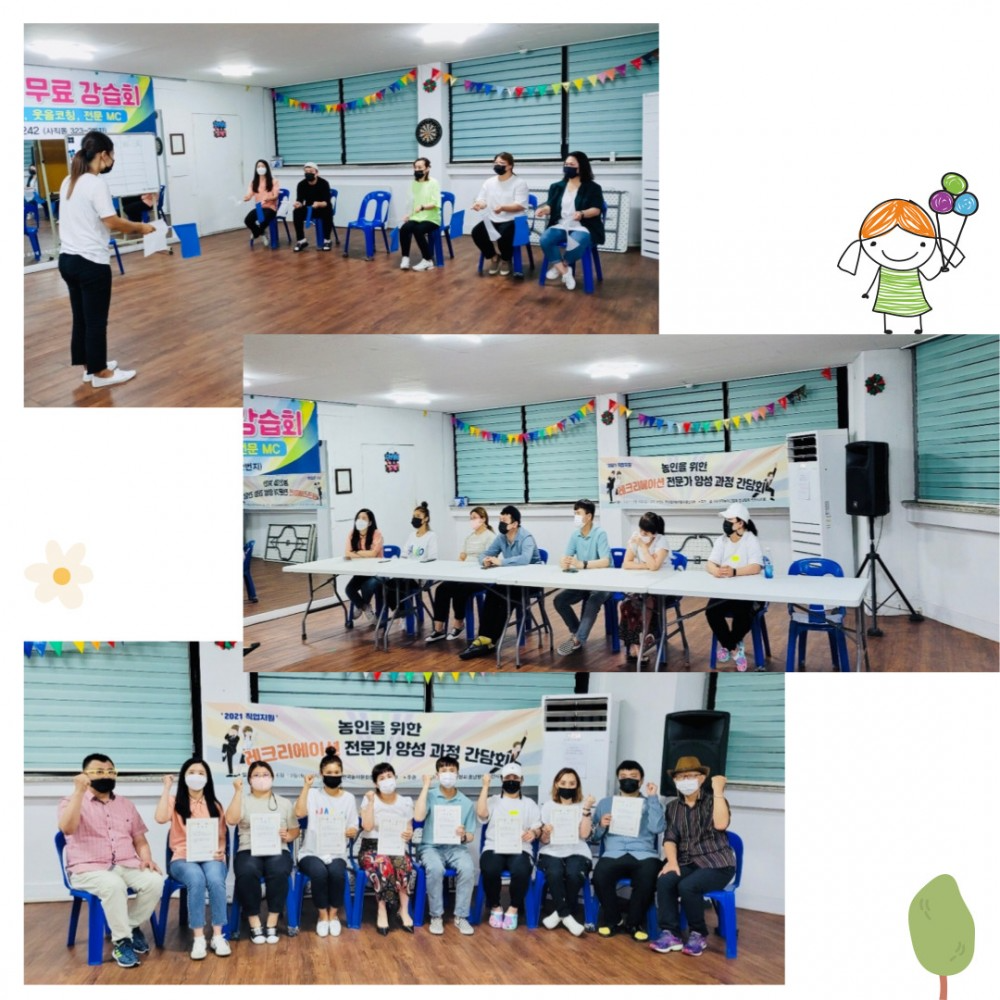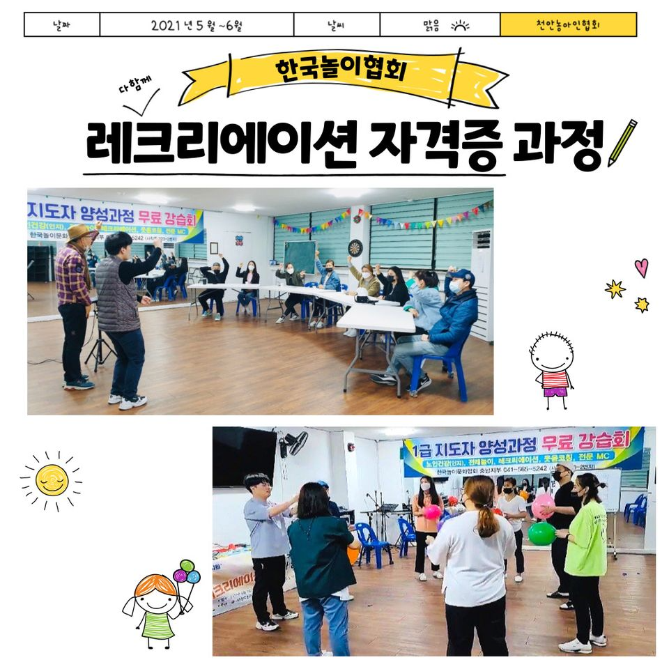 2021년 5월 부터 6월까지 천안시청의 지원을 받아 레크리에이션 자격증 과정을 수료하였습니다!!레크리에이션 수업에서 이론과 실기를 배우며 실전에서 적용할 수 있도록 여러번의 발표도 진행하였습니다.마지막 날에는 검정시험을 치룬 후 합격자에 한하여 자격취득을 하였습니다!레크리에이션 자격증 과정에서 배운 것들을 통해 가족들과 즐거운 시간을 보낼 수 있었고, 미래에 대한 기대도 많아졌다고 하시네요^^마지막으로 5월부터 6월까지 매주 토요일마다 도움을 주신 한국놀이협회 선생님께 감사드립니다~!!!