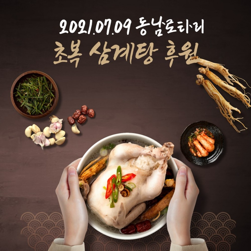 [2021.07.09 국제 로타리 3620지구의 천안 동남 로타리클럽 초복맞이 삼계탕 후원]동남로타리클럽에서 농어르신과 회원을 위해 초복을 맞이하여 삼계탕60인분과 수박2통을 후원을 해주셨습니다.코로나19의 장기화와 폭염으로 인해 지친 나날을 보양식으로 기력을 보충하여올 여름도 건강하길 기원하는 마음으로 후원해주셨습니다또한, 앞으로도 천안시 농인 어르신, 회원들의 건강을 위해 지속적인 관심을 가지고후원해주시로 약속하셨습니다!매년 농인 어르신들과 회원들을 위해 삼계탕 후원을 해주시는 동남로타리 신태규 회장님과 회원분들께 감사의 말씀드립니다^_^