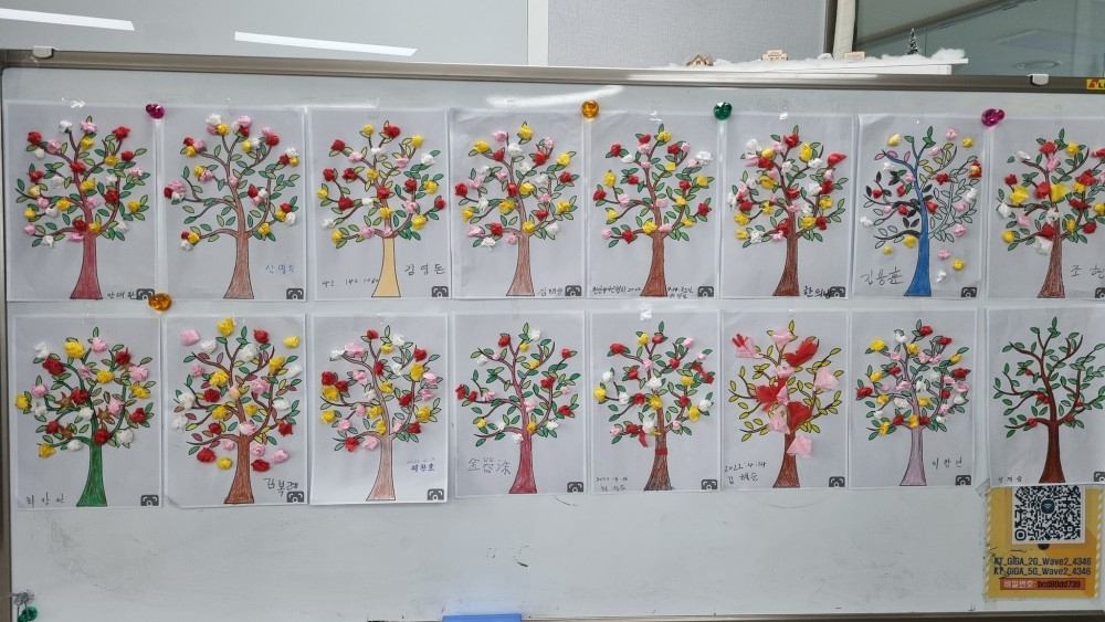 어르신들이 벚꽃나무를 완성하신 후 벚꽃 꾸미기를 보면서 서로 "잘했다"라고 하시고