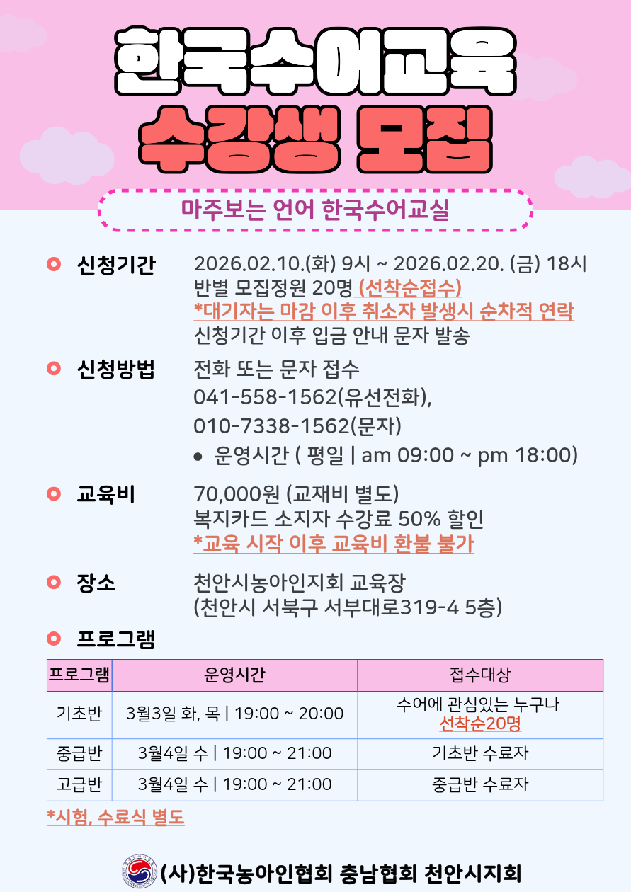 청각언어장애로 인한 의사소통의 불편함을 해결하고 수어교육을 통해 수어인구를 확대하여사회활동 및 경제적인 활동이 능동적으로 이루어질 수 있도록 한다.